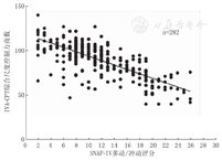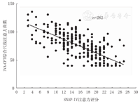 SNAP-Ⅳ评定量表可以做定性和等级的评价[16]。目前,IVA-CPT还不能进行严重程度的等级评价,仅仅用定性判断会造成较大的误差,例如:SNAP-Ⅳ问卷注意力不集中分量表得分为14分诊断为注意力缺陷,IVA-CPT综合控制力商数86,诊断为正常。本研究也发现,2种方法在进行定性诊断ADHD存在一致性,但一致性不强。综合尺度注意力商数和综合尺度控制力商数是衡量注意缺陷和多动冲动的最佳尺度,IVA-CPT中用两者分别代表注意缺陷和多动冲动的数值(数值越大越好)。SNAP-Ⅳ评定量表的得分为所有条目的得分之和(分值越大越差)。在分析影响一致性的原因之后,继续进行2种方法中定量数据的相关性分析,结果显示,两者具有很强的负相关。