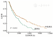 使用TCGA数据库中的SKCM数据集,收集了473例临床样本,其中包括368例SKCM转移样本、104例原发性样本和1例癌旁正常组织样本。在线分析结果显示,SLC24A5的mRNA水平在SKCM组织中明显高于癌旁正常组织(均P<0.05),如图1所示。该结果证实了SLC24A5与SKCM存在相关性。此外,高表达SLC24A5的患者的预后生存期明显短于中低表达SLC24A5的患者(P=0.012),如图2所示。