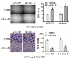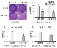将MEL-526和SK-HEL-5人黑色素瘤细胞株在培养箱中在37 ℃、95%相对湿度和5%CO2的条件下培养。MEL-526和SK-HEL-5细胞的培养液由体积分数为10%的FBS和RPMI-1640培养基配制而成。经携带shRNA质粒处理的MEL-526和SK-HEL-5细胞为shRNA组,未做任何处理的细胞为对照组。