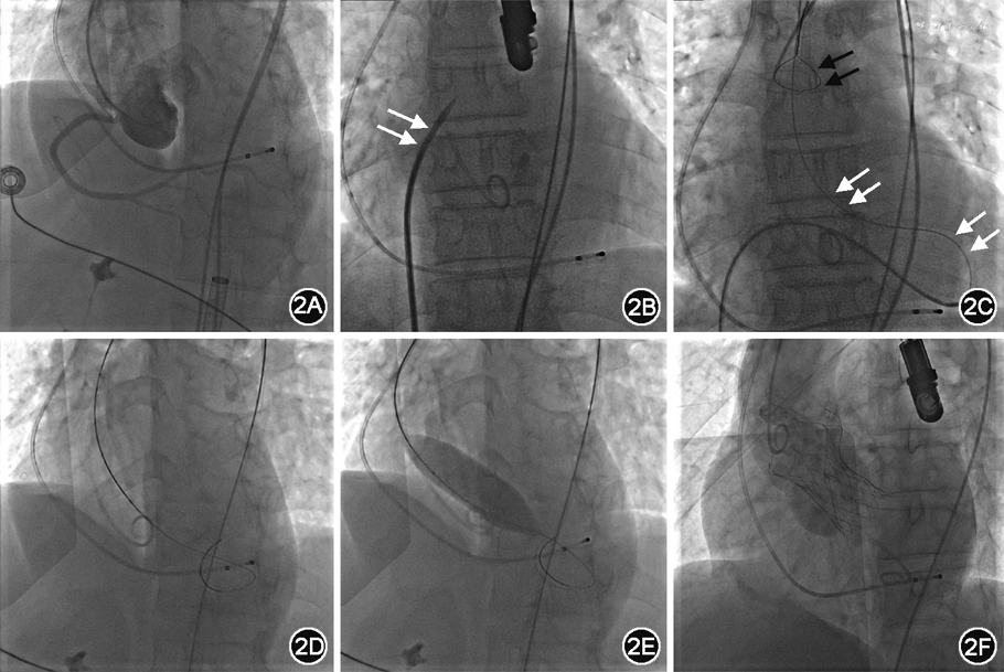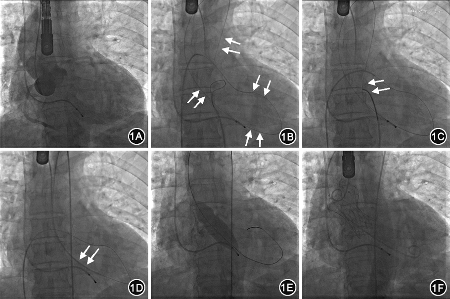 病例2 患者男,63岁,因“劳力性呼吸困难1年,加重1个月”入院。既往身体健康。入院体格检查:心律不齐,第一心音强弱不等,主动脉瓣听诊区可闻及Ⅲ/6级收缩期喷射样杂音。超声心动图示:主动脉瓣二叶式畸形(type 0型),主动脉瓣重度狭窄(瓣口面积0.5 cm2,压力阶差 84 mmHg)并轻度关闭不全,瓣膜可见重度钙化,活动受限。诊断为:重度AS。入院后经多方讨论并征求家属意见决定行TAVI治疗。手术采用全身麻醉,以右股动脉为主路,右桡动脉为辅路。术中经右股动脉在6 F Amplatzer L(美国强生公司)、JR 4.0等导管支撑下,导丝多次尝试跨主动脉瓣进入左心室,均未能成功。遂穿刺右股静脉,行房间隔穿刺。沿股静脉送260 cm超滑导丝至上腔静脉,经导丝送Swartz长鞘(美国St. Jude Medical公司),撤出导丝,经Swartz长鞘送房间隔穿刺针,前后位下拉长鞘至出现第2次跳跃,右前斜45°穿刺针弧度消失呈直线状时出针,左前斜30°造影证实穿刺针进入左心房后,沿穿刺针跟进鞘芯,退出穿刺针后经鞘芯送260 cm超滑导丝至左心房、左心室,跨主动脉瓣进入主动脉。再经右股动脉送抓捕器至降主动脉,抓捕导丝至体外完成轨道建立,最终完成手术(图2)。