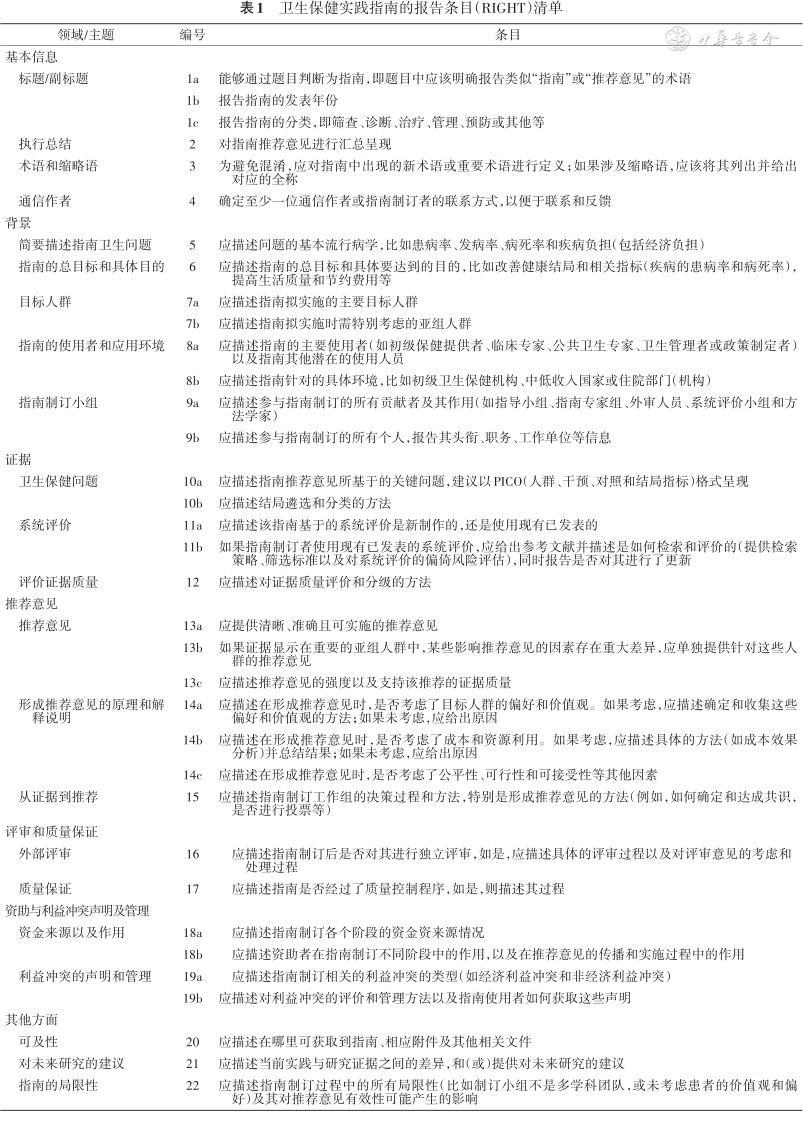 报告规范能够提高指南撰写的完整性和透明度,增强指南推荐意见的可信度,同时也有助于使用者更好地理解和实施指南。当前国际上用于指导指南报告的文件有AGREE报告清单[30]和RIGHT清单[7]。其中RIGHT清单包含7个领域的22个条目,具体见表1。RIGHT目前有多个扩展版(http://www.right-statement.org/),譬如针对患者版本的指南、改编版指南、中医药指南和针灸指南等,可供不同指南类型在报告时参考。指南完成后,推荐通过多版本(包括基层版和患者版)、多语种、多渠道(图像、音视频)发表指南,并尽可能提供可免费获取的方法和路径。