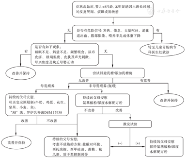 肠绞痛引起的啼哭,其发作周期、发作性质和亢进性等表现与婴儿正常啼哭形成区别。第一,肠绞痛常发作于下午或晚间,啼哭突然发生,有明显的起始和结束,且与婴儿先前活动状况无关[4,10];啼哭症状在6~8周龄达到峰值,并持续至3~4月龄;第二,与正常啼哭不同,肠绞痛的啼哭声音大且强烈,音调高,如同尖叫,看护者通常无法将其抚慰至平静。第三,患儿可能存在腹部紧张、弓背、握拳、上臂僵硬、腿部上抬等情况。临床医生应对婴儿进行全身仔细检查,特别注意是否存在发热、倦怠、大量呕吐、腹部膨胀、喂养不足或体重下降[10]等情况,以上应为临床危险信号,需认真加以甄别。伴有腹部膨胀和呕吐的婴儿,应注意是否有肠梗阻、肠扭转、肠嵌顿、肠套叠等情况。发热、倦怠和喂养不足常提示有潜在感染,需进一步检查,及时治疗。