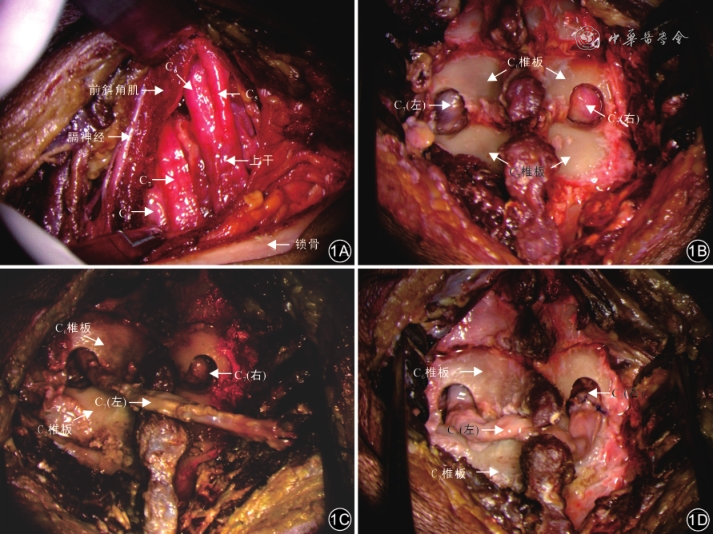 (1)左侧C7神经的显露及测量:头颈部标本平卧位固定,于锁骨中点做一平行于锁骨上缘的横切口,长约6 cm,切开皮肤和皮下组织。沿着胸锁乳突肌外缘探查前斜角肌和中斜角肌,在两层肌肉之间显露臂丛神经,逐步分离出臂丛神经的上干、中干和下干(图1A)。臂丛神经的中干即C7神经。游离左侧C7神经至末端分叉处,测量左侧C7神经末端与锁骨内缘的直线最短距离。在左侧C7神经末端分叉处切断,留置近端备用。相同方法解剖分离显露右侧C7神经至末端分叉处。(2)椎体后通路的建立:翻转标本至俯卧位固定。C臂X线机下定位,以C6/7椎间隙为中心做后正中切口,长约7 cm,逐层切开皮肤、皮下组织和颈后肌肉。应用椎板牵开器辅助显露C6和C7椎板及棘突,扩大去除棘间韧带,在左右椎间孔内侧后壁各磨开一小孔,显露双侧C7神经(图1B);从左侧椎间孔磨开的小孔处引出C7神经(图1C),并测量引出的C7神经长度(左侧椎间孔后壁至C7神经末端)。右侧椎间孔后壁处切断右侧C7神经,留置断口远端用于吻合移位的神经。将左侧引出的C7神经通过棘突间隙移位,并直接对位吻合至右侧椎间孔后壁处C7神经的远端(图1D)。术毕测量颈椎后路C7神经移位的最短距离,即从左右侧椎间孔后壁开窗处C7神经的最短距离;测量椎间孔后壁磨除的最小宽度(即显露C7神经的内外侧壁的骨窗宽度)、椎间孔后壁关节突关节的长度(即椎间孔后壁关节突关节的内外侧的距离),以及计算两者的比值。