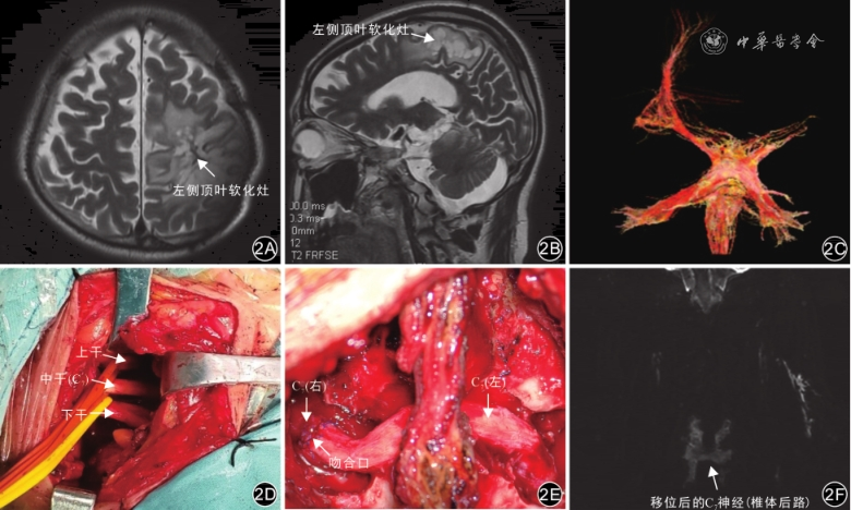 回顾性研究。纳入2019年11月—2020年12月江苏省苏北人民医院脑出血后上肢痉挛性瘫痪患者1例,采用经颈椎后路健侧C7神经移位手术治疗。患者男,45岁,因“脑出血术后2年余伴右侧肢体偏瘫”于2019年12月15日入院。临床表现:右上肢肌痉挛伴右侧肢体偏瘫。入院时查体:神志清楚,左侧上下肢肌力5级,肌张力正常;右上肢肌力0级、肌张力3级,右下肢肌力2级、肌张力1级,生理反射存在。头颅MRI:左侧顶叶软化灶;头颅MR DTI检查:左侧皮质脊髓束较稀疏;臂丛神经MRI检查:左侧C7神经长度约4.6 cm,右侧C7神经长度约4.7 cm。