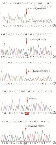 3.基因检测结果:13例患儿均应用二代高通量测序进行SLC25A13基因变异分析,共检出13种基因变异类型,分别为c.852_855delTATG、c.511dupG、c.1638_1660dup、IVS16ins3kb、c.1078C>T、c.615+5G>A、c.742G>A、c.44G>A、c.1311+1G>A、c.1399C>T、c.889G>T、c.1177+1G>A、c.1841+3_1841+4del,经验证分别来自父亲和母亲,见表3。最常见的是c.852_855del TATG移码变异;c.1841+3_1841+4del、c.742G>A、c.511dupG、c.44G>A、c.889G>T为新发变异,其中c.1841+3_1841+4del、c.511dupG和c.889G>T的致病性经MutationTaster、SIFT和FATHMM预测,提示为疑似致病变异。5种新发变异位点的外显子Sanger测序图,见图1。