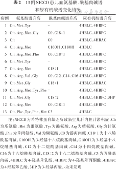 13例NICCD患儿血氨基酸、酰基肉碱谱和尿有机酸谱变化情况