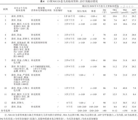 13例患儿均得到随访,至2020年9月,最小5个月,最大3岁10个月。其中3例(病例3、6、11)在婴儿早期出现明显生长发育落后,身长、体重均<-2SD,给予喂养指导及营养补充后2岁时身长、体重追赶至~1SD;1例(病例8)在6月龄时智力评估明显落后(DQ<70分),辅助康复训练治疗,1岁3个月智力评估基本恢复正常(DQ>85分);3例(病例2、4、7)1岁后出现明显饮食偏好,喜食肉类、豆类,拒食或少食高碳水化合物类食物;其他患儿身长/身高、体重及智力评估均正常,13例NICCD患儿的临床资料、治疗及随访情况见表4。