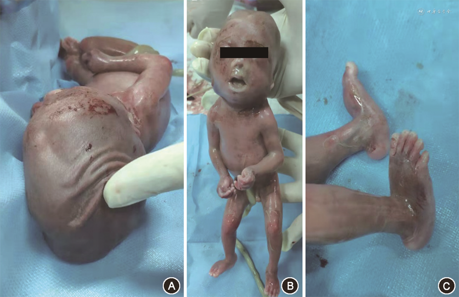 孕妇26岁,孕2产0。因孕21周外院产前超声检查提示“胎儿水肿可能”于2020年9月17日转入福建医科大学附属第一医院。此次妊娠孕妇从未感到胎动。孕21周+4复查产前超声显示胎儿头部皮下组织增厚、颈后皱褶厚度(nuchal fold,NF)增厚;口部呈微张状态,检查时始终未见明显吞咽动作;胸廓狭小、胃泡明显缩小;四肢姿势异常、固定:上肢呈半屈曲状态,下肢呈伸直状态,反复检查始终未见肢体运动,双足后跟软组织回声增厚,呈摇椅足畸形,形似“蜡像娃娃”(图1);羊水处于正常范围(最深径5.37 cm)。超声印象:胎儿运动不能畸形序列征(fetal akinesia deformation sequence,FADS)可能。该孕妇第1次妊娠因“胎儿畸形”于孕25周引产一女婴,该女婴产前染色体核型分析正常,染色体微阵列分析未检出染色体非整倍体或100 kb以上已知的、明确致病的基因拷贝数变异。夫妇双方均未行染色体检查,平素均体健,否认近亲婚配,否认家族及遗传病史。