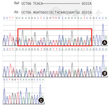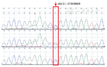 经超声科及妇产科多学科会诊后,考虑FADS可能性大,预后极差。该夫妇考虑此次妊娠胎儿超声征象与前次妊娠相仿,遂决定终止妊娠。于孕22周+1引产一死男婴,其外观多发畸形:头部及颈部水肿增厚、松弛;呈张口状态,四肢关节僵硬、姿势固定:双肘关节呈屈曲状,双踝关节稍屈曲,双髋关节、膝关节呈伸直状态,双足呈摇椅足畸形(图2)。与产前超声检查结果相符。取引产胎儿腓肠肌组织和父母外周血行全外显子组测序(广州嘉检医学检测有限公司),检测到RAPSN基因(在线人类孟德尔遗传数据库编号*601592)复合杂合变异:c.149_153delinsAGATGGGCCGCTACAAGGAGATGG(p.V50Efs*114)和c.227T>C(p.L76P)。行Sanger测序验证,结果显示这2个变异分别遗传自父亲及母亲(均为杂合子),见图3和图4。根据美国医学遗传学与基因组学学会的变异解释标准和指南[1],父源变异(p.V50Efs*114)为致病性变异(证据等级为非常强1+中等2+支持证据5+支持证据3),美国生物技术信息中心数据库收录编码为rs1131691986;母源变异(p.L76P)为临床意义未明变异(证据等级为中等2+支持证据3),美国生物技术信息中心数据库未有该变异记录。在线人类孟德尔遗传数据库中收录RAPSN基因与FADS 2型(孟德尔遗传病表型编号#618388)有关,遗传方式为常染色体隐性遗传。根据胎儿的临床诊断结果推测,母源变异(p.L76P)为本例胎儿新发致病性变异,故引起胎儿表型的遗传学原因为RAPSN基因上2个致病性变异的复合杂合变异,胎儿确诊为FADS。