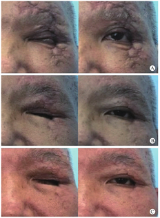 患者男,57岁。2020年5月因外伤致左侧外眼角及上、下眼睑皮肤5 cm纵行不规则皮肤裂伤,伤及肌层。予以清创缝合术,眼睑修补术。术后2周出现左眼视物不清、闭合困难等症状,瘢痕增生明显,并伴挛缩,左眼睑闭合困难,下睑外翻(图1A),严重影响生活。