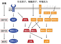 注:MAPK为丝裂原激活蛋白激酶;RTK为受体酪氨酸激酶;TGFBR1为转化生长因子β受体1;CDC42为细胞分裂周期蛋白42;RAC1为RAS相关C3肉毒杆菌毒素底物1;MAP3K为丝裂原激活蛋白3激酶;MAP2K为丝裂原激活蛋白2激酶;RAF为快速加速的纤维肉瘤;MEK1/2为丝裂原活化的细胞外信号调节激酶1/2;ERK1/2为细胞外信号调节激酶1/2;HPK为造血祖细胞激酶;MKK为丝裂原活化蛋白激酶激酶;ASK1为细胞凋亡信号调节激酶1;TAK1为转化生长因子激酶1;MEKK为丝裂原活化的细胞外信号调节激酶激酶;JNK为c-Jun NH2末端激酶