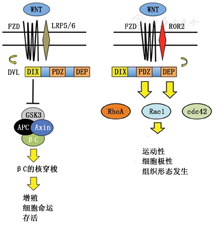 Wnt信号通路参与调控细胞增殖、凋亡、分化、存活及癌变等生理病理过程[19,20],其共同特征是Wnt配体与触发独特信号事件的膜表面受体相互作用,产生与特定Wnt通路相关的生物学结果[19]。Wnt信号通路可分为经典通路(Wnt/β-catenin,Wnt/βC)和非经典通路(Wnt/PCP通路和Wnt/Ca2+通路)[19,20]。最具特色的Wnt信号通路是Wnt/βC,靶向动态胞浆蛋白βC,通过细胞核再定位和基因表达调节来响应配体受体结合[19,20]。Wnt/βC信号通路主要由细胞外Wnt蛋白、7次跨膜卷曲蛋白受体、低密度脂蛋白受体相关蛋白5/6、散乱蛋白、糖原合成酶激酶3β(glycogen synthase kinase 3β,GSK3β)、结肠腺瘤性息肉蛋白、轴蛋白、β-catenin等信号分子组成(图2)[19]。在稳态时,轴蛋白、结肠腺瘤性息肉蛋白和GSK3β与β-catenin形成降解复合体,GSK3β对β-catenin磷酸化,使磷酸化的βC被识别并降解[19,20]。当Wnt配体与由7次跨膜卷曲蛋白受体和低密度脂蛋白受体相关蛋白5/6组成的受体复合物结合时,散乱蛋白被激活,降解复合物解体且释放β-catenin,β-catenin易位于细胞核,控制与细胞命运、增殖和存活基因相关的转录[19,20]。与Wnt/βC通路不同,Wnt/PCP通路活化与β-catenin积累无关,并且在初始激活时必须要有辅助受体酪氨酸激酶样孤儿受体2参与,散乱蛋白被激活后,激活小GTP酶Rac1、RhoA和cdc42,这些酶会引发细胞骨架重排[19]。Wnt/PCP信号负责在组织形态形成过程中调节细胞运动[19]。在Wnt/βC和Wnt/PCP之间存在串扰,这种串拢是PASMC对损伤调节的反应,而这种损伤反应可能会导致PH的功能失调并造成PASMC的行为异常[19]。此外,在PASMC和PAEC中也发现BMP和Wnt之间的信号串拢,BMP2可同时激活Wnt/βC和Wnt/PCP介导血管再生[19]。BMP2触发β-catenin活化不依赖于Wnt配体刺激,而是通过上调基因,如VEGF、存活蛋白和细胞周期蛋白D1,或诱导细胞增殖和存活[19]。BMPR2还能活化Wnt/PCP下游介质RhoA和Rac1[19]。Wnt/PCP下游Rac1和cdc42活化还可以连接MAPK通路。