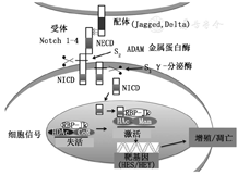 Notch信号通路是高度保守信号通路,在细胞增殖、分化和凋亡中也起关键作用[20]。有4种Notch受体(Notch-1、Notch-2、Notch-3、Notch-4)和5种Delta/Serrate/Lag-2(DSL)配体,Notch-1/4主要在内皮细胞表达,而Notch-3在血管平滑肌细胞表达[20]。由于Notch受体和配体含有跨膜蛋白结构域,因此Notch通路的信号转导主要发生在相关的细胞间[20,25]。在Notch通路中,当配体结合,Notch细胞外结构域迁移并在位点2被蛋白酶ADAM10裂解,然后γ-分泌酶裂解Notch膜内锚定结构域位点3,释放各种形式的Notch细胞内结构域,然后它们全部转移至细胞核并与RBP-Jk形成活性转录复合物,调节靶基因的转录活化[20]。Notch受体与其配体间的相互作用发生在相邻细胞上,当它们在同一个细胞出现时,活化将被抑制(图3)[20]。