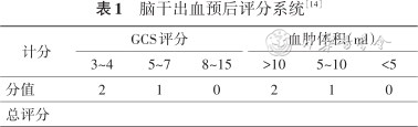 PBSH患者的30 d病死率在47%~80%,出血部位和出血量不同,病死率亦有差异[12, 13]。存活患者中,绝大多数遗留严重神经功能障碍[61]。既往研究发现,原发性脑出血患者早期昏迷、呼吸机辅助通气、血肿量较大(>5 ml)及合并脑积水等均与患者不良预后相关[2,6,54,61]。2017年,Huang等[14]在Stroke杂志上发表新的脑干出血预后评分系统(表1),根据GCS评分和血肿量设定分值,总评分0、1、2、3和4的患者发病后30 d病死率分别为2.7%、31.6%、42.7%、81.8%和100%。
