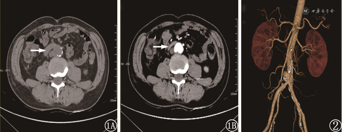 患者男,64岁,因“呕血、黑便4 d” 入院。患者无腹痛、发热。既往有冠心病病史,不规律服用阿司匹林。体格检查:血压105/53 mmHg,神志清楚,贫血貌,腹软,无压痛反跳痛。血常规:红细胞2.45× 109/L,Hb 67 g/L。胃镜和结肠镜检查提示胃、十二指肠球部降部和大肠均未见异常,腹部增强CT发现腹主动脉壁和双侧髂动脉壁多发钙化斑块,腹主动脉近髂总动脉分叉处呈瘤样扩张,约25 mm× 24 mm,瘤体凸向十二指肠水平部,和十二指肠之间的脂肪间隙消失,未见造影剂溢入毗邻肠腔(图1)。患者入院后第10天再次便血3次,总量约1 300 ml,并出现意识丧失,血压进行性下降,动脉血气Hb 37 g/L,乳酸6 mmol/L,转入普外ICU给予输血和抗休克治疗。患者循环稳定后急诊行血管造影未见造影剂外溢,剖腹探查术中行胃十二指肠镜检查见胃腔和十二指肠球部、降部大量新鲜血液和血凝块,无出血点,十二指肠水平部有活动性出血,遂切开十二指肠探查,可见十二指肠水平部有一小溃疡,溃疡中心喷射状出血,与腹主动脉瘤相通,压迫出血时可触及肠壁外搏动的腹主动脉和质硬的腹主动脉钙化斑块,结合术前增强CT术中诊断:主动脉十二指肠瘘(aortoduodenal fistula,ADF)。行腹主动脉十二指肠瘘缝合关闭+胃窦离断关闭+胃空肠毕Ⅱ式Roux-en-Y吻合。术后出血停止,术后第5天行CT主动脉造影血管三维重建提示腹主动脉瘤,未见造影剂外溢(图2)。术后第20天患者再次出现便血,急诊行腹主动脉覆膜支架植入后患者再无消化道出血,痊愈出院。