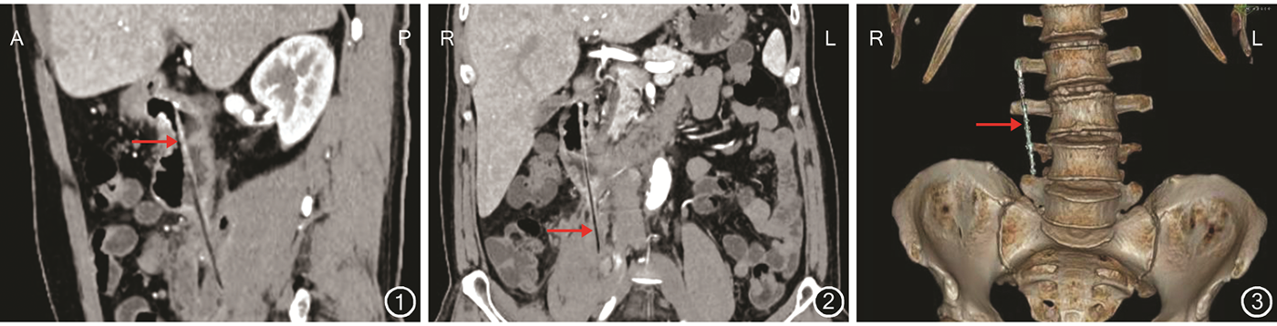 患者男,52岁。因右季肋区及腰背部疼痛10 d伴发热入院。患者10 d前无明显诱因出现右季肋区及右侧腰背部疼痛,伴恶心、呕吐,肛门排气、排便停止。曾于当地医院就诊,腹部X线片检查结果示部分肠道扩张,口服头孢哌酮后病情未好转,遂就诊于我科。患者有原发性高血压病史10年,无心脏病史、糖尿病史;自述6年前曾酒后吞食木筷,无明显症状,未予诊断与治疗。患者入院体格检查:体温38.0 ℃,心率78次/min,呼吸17次/min,血压150/100 mmHg(1 mmHg=0.133 kPa);腹部膨隆,轻度腹胀,右季肋区压痛、反跳痛、局部肌紧张;移动性浊音阴性,肠鸣音减弱;右肾区叩击痛,右输尿管走行区可疑压痛,其余体格检查均为阴性。患者入院辅助检查:WBC计数14.38×109/L,嗜中性粒细胞85%,C-反应蛋白20.44 mg/L。患者术前拒行胃镜检查。腹部增强CT检查结果显示:十二指肠降部条状高密度异物影,边界清晰,异物穿破十二指肠降部向下刺入右侧腰大肌,腹膜后少量积气伴周围脓肿形成,病灶局部与右侧输尿管中段分界不清晰。见图1, 2, 3。