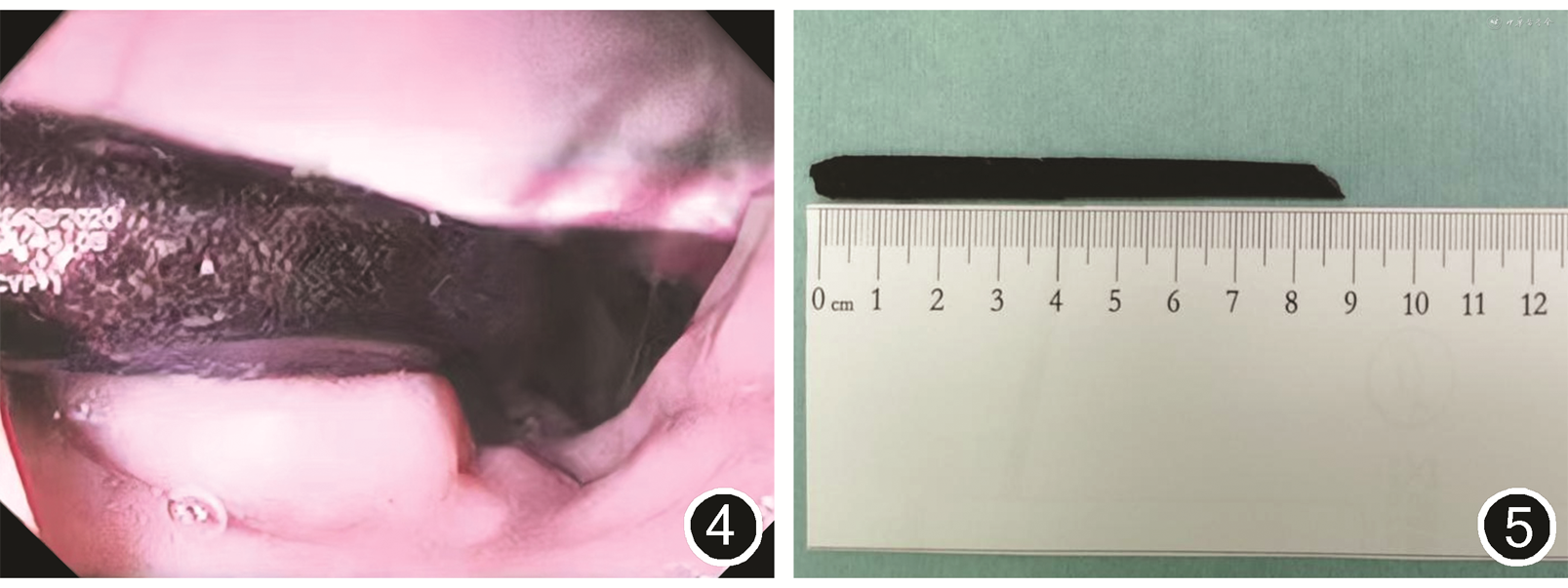 患者及家属术前签署知情同意书。2020年8月20日患者于全身麻醉下行腹腔镜十二指肠异物取出术。术中游离大网膜,松解结肠肝曲与后腹膜愈着处,于右侧髂血管上方约1 cm处切开小肠系膜,见小肠系膜充血水肿,与周围组织粘连密切。继续分离至腰大肌内侧,见含大量黄色脓性物质窦道。完全清除积脓后,继续沿窦道分离显露十二指肠,根据术前CT检查结果提示异物应该处于该区域。但术中探查后只发现窦道与十二指肠降部后壁的连接,未发现异物,遂行胃镜检查定位异物位置。胃镜检查结果示十二指肠降部见黑色条形异物(图4),降部后壁发现一小凹,肠壁完整。胃镜下尝试取出异物失败。于幽门附近全层切开胃前壁约4 cm,将异物完整取出(图5),连续缝合胃壁并行浆肌层包埋。胃镜检查充气后未见漏气,且无异物残留。留置2根腹腔引流管监测术后吻合口漏。患者顺利完成手术,手术时间为315 min,术中出血量为300 mL,术中输注RBC悬液1.5 U。术后继续给予抗炎、抑酸、营养支持、对症治疗。患者术后恢复良好,体温恢复正常,术后第2天下床活动和肛门排气,第5天进流质食物,第7天拔除腹腔引流管,无并发症发生。患者术后第9天出院,随访至2021年11月,无不适主诉。