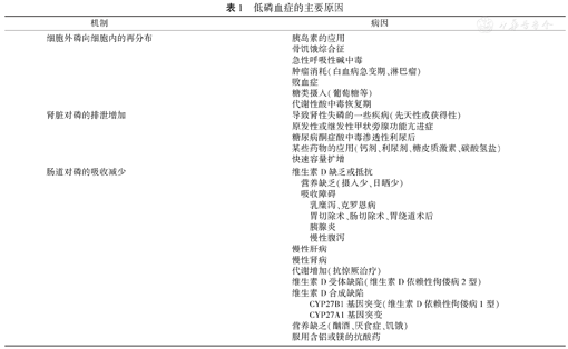 临床上低磷血症并不少见,其病因包括肠道磷吸收减少、细胞外磷向细胞内转移和肾脏对磷的排泄增加等三个主要方面(表1)。但引起低血磷性佝偻病/骨软化症者多数为肾脏对磷的排泄增加,主要见于遗传性疾病,少数为获得性原因引起,其中遗传性低血磷性佝偻病/骨软化症的致病基因和主要临床特征见表2