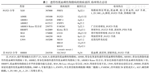 注:FGF23:成纤维细胞生长因子23; XLH:X-连锁显性低血磷性佝偻病;ADHR:常染色体显性遗传性低血磷性佝偻病;ARHR1:常染色体隐性遗传性低血磷性佝偻病1型;ARHR2:常染色体隐性遗传性低血磷性佝偻病2型;ARHR3/Raine综合征:常染色体隐性遗传性低血磷性佝偻病3型;HRHPT:低血磷性佝偻病合并甲状旁腺功能亢进症;MAS:McCune-Albright综合征;OGD:颅面骨发育不良;LNSS:线样表皮痣综合征;HHRH:伴高钙尿症的遗传性低血磷性佝偻病;DMP-1:牙基质蛋白1; ENPP1:外生核苷酸焦磷酸酶/磷酸二酯酶1; FAM20C:序列相似20家族成员C; ALP:碱性磷酸酶;1,25(OH)2D3:1,25-二羟维生素D3