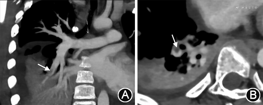 治疗经过:入院后急症行右髂骨骨髓炎开窗减压+肌间脓肿清理+封闭式负压引流(vacuum-assisted closure,VAC)术,术后体温仍有反复,予万古霉素、亚胺培南西司他丁抗感染。患儿术后26 h出现高热寒战,测体温41 ℃,心率159次/min,呼吸52次/min,血压159/139 mmHg,脉搏细数无力,四肢末梢凉,经皮血氧饱和度0.88~0.91,以“严重脓毒症”转至小儿重症医学科。急查血气分析示动脉血氧分压50 mmHg,诊断呼吸衰竭,予气管插管呼吸机辅助呼吸。床边胸X线片示符合支气管肺炎并右下肺实变表现。床旁超声心动图示三尖瓣探及轻度反流信号,估测肺动脉收缩压63 mmHg,因肺动脉高压原因不明,行心脏CT血管造影(CT angiography,CTA)示符合右下肺动脉栓塞表现(图1),同时完善双下肢动静脉血管超声未见异常。遂予依那肝素皮下注射抗凝,100 U/(kg·次),2次/d。患儿应用呼吸机辅助呼吸1 d后即撤机,未使用血管活性药物,但体温仍反复,第9天行左髋部探查+右髂骨骨髓炎清创换药+VAC负压引流术,第12天体温正常并转回小儿骨科。转科后改利伐沙班口服抗凝,15 mg/次,1次/d。入院1个月后复查CTA示原右下肺动脉部分分支管腔内原充盈缺损消失。住院36 d后好转出院,共应用万古霉素21 d,氟氯西林钠15 d。出院后继续口服利伐沙班1个月。随访至2021年1月,无不适。