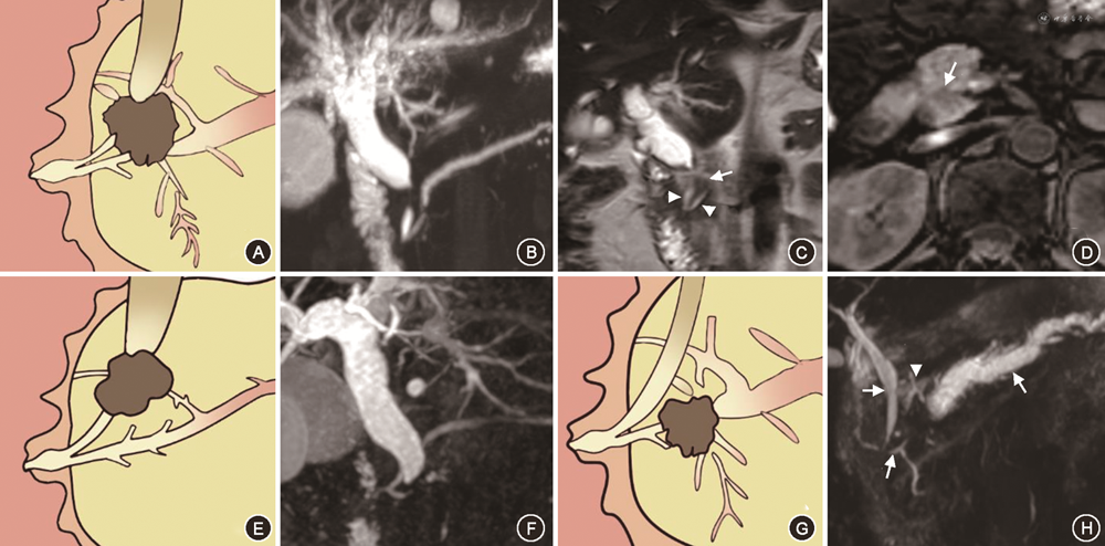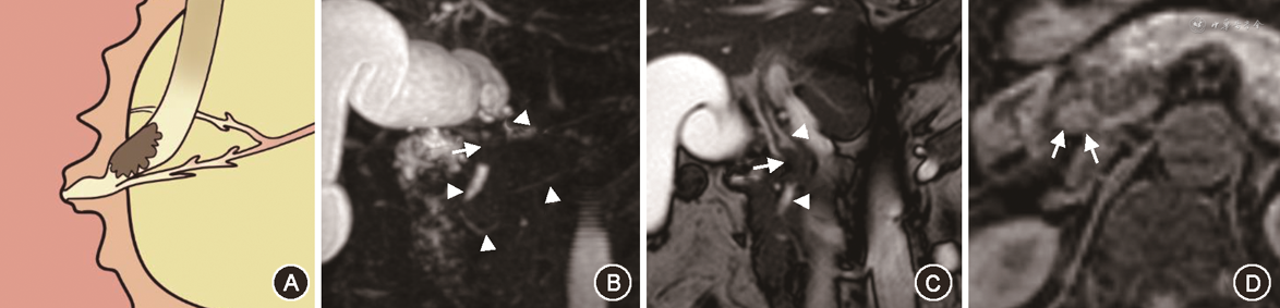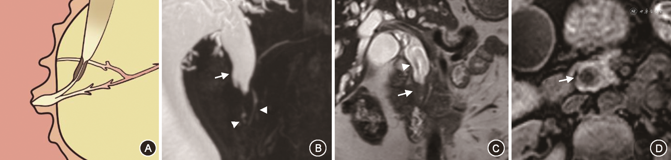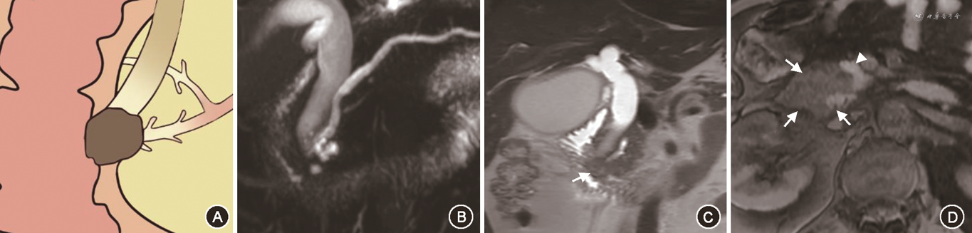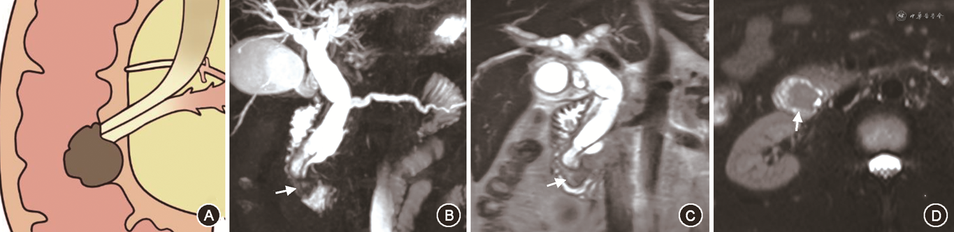 由2名经验丰富的放射科诊断医师采用盲法独立分析MRI图像,若对结果有异议,则由第3名高年资诊断医师给出最终判断。每一项指标取2名医师测量的平均值。评价指标及具体评价内容请见表2、3。根据MRI平扫及MRCP图像特征将病变分为5种类型:十二指肠乳头结节型、胰腺肿块型、胆总管壁增厚型、壶腹部肿块型及胆总管腔内结节型,详见图1, 2, 3, 4, 5示意图。
