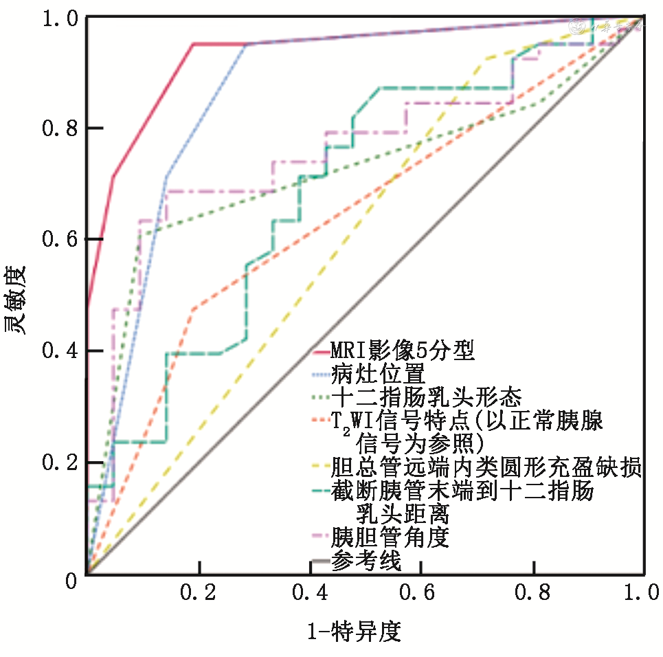 将有意义单因素指标(病灶位置、十二指肠乳头形态、T2WI病灶信号特点、胆总管远端内类圆形充盈缺损、截断胰管末端到十二指肠乳头距离、胰胆管角度)与MRI影像5分型的诊断效能进行比较(表5)。MRI影像5分型的AUC最大,为0.932(95%CI:0.867~0.997),其诊断效能高于任一有意义单因素指标(Delong 检验,P均<0.05)(图6)。