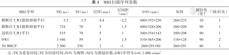 患者均在术前采用荷兰飞利浦INGENIA 3.0 T MRI扫描仪进行检查,检查前禁食 6~8 h,并进行呼吸训练。检查取仰卧位,扫描范围为肝脏膈顶部至十二指肠水平部。扫描主要序列及具体参数见表1。
