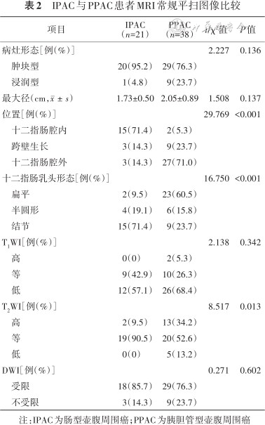 MRI由于软组织分辨率高,且磁共振胰胆管水成像(magnetic resonance cholangiopancreatography,MRCP)可以展示胆道系统的整体性和连续性,以及弥散加权成像(diffusion-weighted imaging,DWI)能够在分子水平提供人体组织器官的功能信息等优势,已成为壶腹区全面精确且无创的影像学诊断方法之一[5]。但目前对PAC病理亚型的MRI研究相对较少,本研究回顾性分析了IPAC和PPAC在MRI常规平扫、MRCP以及DWI图像上的不同征象,提出了一种MRI分型方法,旨在提高术前PAC组织学亚型的诊断准确率,从而为临床治疗和预后评估提供帮助。
