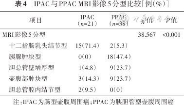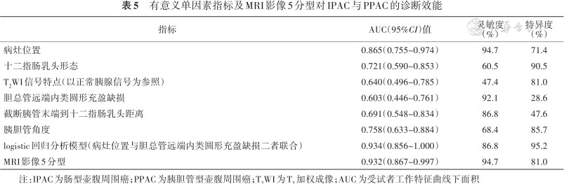 MRI影像5分型可以在术前提高鉴别诊断IPAC及PPAC的准确率,其诊断效能优于任一单因素有意义指标,且可与logistic回归分析模型的诊断效能相媲美。