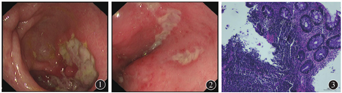 全身浅表淋巴结未扪及;心肺无异常;腹部平坦,无压痛和反跳痛,肝脾肋下未扪及。入院后24 h内完善相关实验室检查,中性粒细胞占比为0.739,血红蛋白为96 g/L,C反应蛋白为74.6 mg/L、红细胞沉降率(erythrocyte sedimentation rate,ESR)为87 mm/1 h,结核感染特异性T细胞检测(T-spot.TB)B抗原阳性[以每1×106个外周血单个核细胞(peripheral blood mononuclear cell,PBMC)中斑点形成细胞(spot forming cell, SFC)的数目计,为120 SFC/106PBMC],抗酿酒酵母抗体呈弱阳性;EB病毒免疫球蛋白M(immunoglobulin M,IgM)、巨细胞病毒DNA、粪便细菌培养均为阴性。2013年1月25日行结肠镜检查示回盲部回盲瓣对侧见一大溃疡型肿物,表面糜烂且有白苔附着、凹凸不平;直肠见多发裂隙状纵行溃疡,表面有白苔附着;诊断为回盲部溃疡、直肠多发溃疡(图1、图2);镜下取活体组织进行病理检查,结果示(回盲部)黏膜组织中重度急慢性炎,淋巴组织增生,局部固有腺体减少,可见隐窝炎,间质可见肉芽组织形成,结合临床病史符合炎症性肠病(图3)。2013年1月26日行胸部计算机断层扫描(computed tomography,CT)检查示双肺支气管扩张伴感染,右肺为著,右侧胸膜增厚。