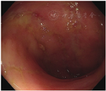 2016年5月15日患者无明显诱因再次出现腹痛、腹泻,伴便血,于当地医院抗感染治疗无效,第3次就诊于解放军总医院第七医学中心消化内科。入院后24 h内复查血常规示白细胞计数为20.37×109/L,中性粒细胞占比为0.963,中性粒细胞绝对值为19.6×109/L,血红蛋白为96 g/L,血小板计数为316×109/L;查C反应蛋白为125 mg/L;查ESR为91 mm/1 h。2016年5月18日复查结肠镜示升结肠、乙状结肠和直肠多发小片状纵行溃疡,横结肠见大片状溃疡;取活体组织行病理检查示(横结肠、乙状结肠、直肠)大肠黏膜组织中重度慢性炎伴中度急性炎和糜烂,部分腺体呈腺瘤样增生,可见隐窝脓肿和肉芽组织。经多学科协作讨论认为发病初期不除外肠结核,诊断性抗结核治疗无效,结合病史和结肠镜、病理检查结果,临床诊断为克罗恩病,改用醋酸泼尼松+甲氨蝶呤治疗后,症状、实验室检查指标和内镜下表现均好转,此次再发,考虑为克罗恩病控制欠佳,升级为英夫利昔单抗(ifliximab,IFX)治疗2次后(按标准0、2、6、8周间隔用药)患者临床症状缓解;第5次IFX治疗前(2016年11月2日)复查结肠镜示升结肠、乙状结肠和直肠散在小片状溃疡,有薄白苔附着,周边黏膜充血(图4),较前明显好转。2016年11月5日再次复查T-spot.TB示A抗原阳性(54 SFC/1×106 PBMC),B抗原阳性(60 SFC/1×106 PBMC),结合既往有结核病史,不除外结核复发可能,给予异烟肼、利福平预防性抗结核治疗。第7次IFX输注前(2017年3月8日)复查相关实验室检查,T-spot.TB示A抗原阳性(480 SFC/1×106 PBMC),B抗原阳性(720 SFC/1×106 PBMC),A、B抗原定量均较前明显升高;C反应蛋白为37.7 mg/L,ESR为90 mm/1 h,EB病毒IgM、巨细胞病毒DNA、粪便菌培养均为阴性。不除外结核复发,联系结核专科医院会诊,建议患者停用IFX并于2017年3月20日转至结核专科医院进一步治疗。