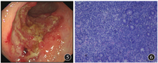 结核专科医院予患者抗结核治疗4个月后多次复查T-spot.TB、结肠镜下活体组织检查病理+抗酸染色、结核分枝杆菌DNA均阴性,医师认为结核病情稳定,但患者腹痛、腹泻加重,排便频率为10次/d,粪便性质呈黄色稀糊样,伴发热,最高体温达39 ℃,自2017年3月8日至7月20日体重下降3 kg。2017年7月20日复查相关实验室检查,白细胞计数为20.42×109/L,中性粒细胞占比为0.739,血红蛋白为96 g/L,血小板计数为490×109/L;粪便常规示白细胞(满视野),红细胞计数为6~8个/高倍镜视野;粪便隐血试验阳性;C反应蛋白为122 mg/L;ESR为93 mm/1 h;EB病毒IgM、巨细胞病毒DNA、肿瘤标志物、T-spot.TB检测均阴性。2017年8月1日复查胸部CT示双肺支气管扩张伴感染,左肺下叶不规则结节,邻近胸膜牵拉,右肺下叶体积缩小,左肺上叶小肺大疱,纵隔淋巴结肿大,右侧胸膜局限性增厚,少量胸腔积液不除外。2017年8月24日完善腹盆部CT检查示升结肠、降结肠、乙状结肠、直肠多发管壁增厚,升结肠壁增厚较明显,邻近系膜增厚,腹部和盆腔内肠管周围多发淋巴结肿大,脾脏肿大。2017年8月25日复查结肠镜示进镜40 cm处见乙状结肠、直肠多发条状和片状深溃疡灶,有厚白苔附着,周边黏膜充血、水肿,触之易出血(图5);取活体组织行病理检查示淋巴样细胞浸润伴细胞异型性,细胞中等大小且大小一致,细胞质淡染,可见核分裂和凋亡细胞,上皮内有异型淋巴样细胞累及(图6);免疫组织化学染色示CD3(弥漫+)、CD2(+)、CD30(+)、T细胞胞质内抗原(+)、粒酶B(+)、CD56(局部少许+)、EB病毒(-);诊断为①非霍奇金淋巴瘤(成熟性T细胞淋巴瘤);②克罗恩病;③结核潜伏感染;④支气管扩张症;⑤右侧卵巢切除术后;⑥阑尾切除术后。经血液科、病理科、普外科多学科协作讨论,考虑患者一般情况较差,手术风险较大,与患者和家属充分沟通后,选择先行内科化学治疗,择期手术治疗。患者在化学治疗过程中出现严重精神症状,终止化学治疗和其他治疗措施,2017年11月3日于家中死亡,死亡原因不明。