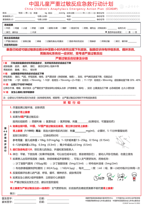 国家呼吸系统疾病临床医学研究中心、中华医学会儿科学分会呼吸学组、中国医药教育协会儿科专业委员会以WAO严重过敏反应指导意见、《中国儿童严重过敏反应诊断与治疗建议》为基础,结合国际上已有的严重过敏反应急救行动计划,制定了《中国儿童严重过敏反应急救行动计划》(China Children′s Anaphylaxis Emergency Action Plan,CCAEAP)。