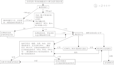 6. 风湿免疫性疾病筛查[16]:完善病史采集、典型症状及体征、免疫球蛋白、补体和自身抗体等检查。风湿免疫性疾病相关HLH区别于其他类型HLH在于疾病早期多表现为非感染因素的白细胞及血小板升高,C-反应蛋白升高,血沉增快和纤维蛋白原升高。随着疾病的进展,炎症指标的异常和血细胞的进行性下降是协助诊断HLH的重要指标。