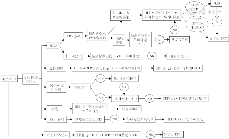 注:CNS为中枢神经系统;CR为完全应答;DEP为脂质体多柔比星-依托泊苷-甲泼尼龙;HLH为噬血细胞综合征;HLH-94为HLH-94方案;HLH-04为HLH-04方案;HSCT为造血干细胞移植;IFN-γ为干扰素γ;IL为白细胞介素;IVIG为静脉注射免疫球蛋白;L-DEP为培门冬酶/左旋门冬酰胺酶-脂质体多柔比星-依托泊苷-甲泼尼龙;MP为甲泼尼龙;NK为自然杀伤;NR为无效