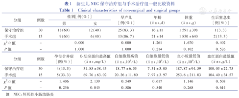 45例患儿中,男27例(27/45,60%),女18例(18/45,40%);年龄(17±12)d(1~45 d);早产儿38例(38/45,84.4%),足月儿7例(7/45,15.6%);体重(1 677±500)g(1 090~3 850 g)。保守治疗组30例(66.7%),手术治疗组15例(33.3%)。手术治疗组患儿C-反应蛋白较保守治疗组高[(69.76±63.02 mg/L vs.(31.85±38.45)mg/L)],差异有统计学意义(P=0.045)。两组在性别、年龄、体重、白细胞最高值、白细胞最低值、血小板最低值、血红蛋白最低值、生后窒息史以及母孕期合并症方面比较,差异均无统计学意义(P>0.05),详见表1。