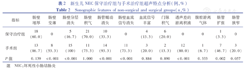 回顾性收集2017年9月至2020年3月首都儿科研究所收治的NEC患儿临床资料以及超声声像图,按照治疗方法的不同分为保守治疗组和手术治疗组,比较分析两组患儿超声声像特征。