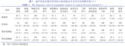 超声检查征像对坏死性小肠结肠炎手术治疗的判断价值(%)