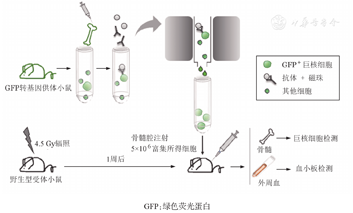 通过磁珠富集绿色荧光蛋白(Green Fluorescent Proteins, GFP)转基因供体小鼠骨髓原代巨核细胞,将其移植入经半致死剂量辐照的受体小鼠骨髓腔,建立原代巨核细胞骨髓腔内血小板生成模型。通过免疫荧光染色、流式细胞术等方法检测受体小鼠中供体来源巨核细胞和血小板形态、大小等指标。