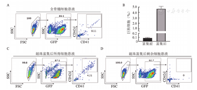 在正常小鼠骨髓中CD41+CD42d+巨核细胞仅为0.05%~0.1%[2]。为获得纯度较高可供移植的骨髓原代巨核细胞,减少骨髓腔注射所需总液体量,本研究以GFP转基因小鼠作为供体,利用磁珠筛选对骨髓CD41+细胞进行富集(图1),最终所得细胞悬液中CD41+CD42d+巨核细胞比例达4%~5%,较富集前提高了近50倍(图2A、图2B、图2C);且在剩余细胞中,CD41+CD42d+巨核细胞比例为0(图2D)。以上结果提示,通过该方式可有效捕获并富集骨髓巨核细胞。随后,我们将富集所得细胞注射入受体小鼠骨髓腔(图1)。为了研究供体巨核细胞的植入情况,我们在移植后48 h进行骨髓原位免疫荧光染色。观察发现,受体骨髓腔内可见供体来源GFP+CD41+巨核细胞,其具有正常巨核细胞的大小及形态(图3),表明磁珠富集与骨髓腔注射的方式足够温和,不会对巨核细胞造成过度刺激与伤害,能够保证其维持正常形态并成功定植于受体小鼠骨髓腔。