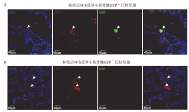 A:移植后48 h受体小鼠骨髓切片原位免疫荧光染色(白色箭头所示为供体来源GFP+巨核细胞);B:移植后48 h受体小鼠骨髓切片原位免疫荧光染色(白色箭头所示为受体小鼠自身巨核细胞)。DAPI标记细胞核,GFP为供体小鼠细胞自发荧光