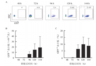移植后72 h,受体小鼠外周血中开始出现少量GFP+血小板,移植后96 h其比例明显上升,在CD41+CD42d+血小板群体中出现明显的GFP+群体(图4A),该部分供体来源血小板总量可达到10×109/L(图4B)。至移植后120 h,GFP+血小板在受体小鼠外周血中的比例达到峰值(图4A、图4C),此时受体小鼠外周血中血小板总量可达20×109/L(图4B)。随后,随着受体小鼠自身造血功能的恢复和供体巨核细胞的消耗,供体来源的GFP+血小板所占比例开始下降。上述结果表明,原代巨核细胞定植于受体小鼠骨髓腔后,可成功在受体小鼠体内发挥其血小板产生功能。