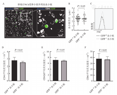 GFP:绿色荧光蛋白。A:移植后96 h小鼠外周血血小板免疫荧光染色(Hoechst标记细胞核,CD41为血小板表面标志分子,GFP为供体小鼠细胞自发荧光);B:移植后96 h受体小鼠外周血血小板直径分布;C:移植后96 h受体小鼠外周血血小板前向角散射(FSC)对比;D、E、F:流式细胞术检测移植后96 h供体来源血小板表面标志分子表达(n=4)