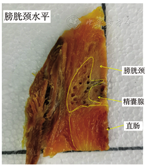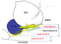 从头侧向尾侧活体和尸体解剖横断面观察所见,在膀胱颈水平,该处NVB精囊腺部脂肪垫较宽大,其边界与直肠前方系膜的直肠固有筋膜投影线存在轻微重叠,该水平为NVB精囊腺部的末端,向尾侧移行为NVB前列腺部。见图3。