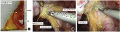 该处NVB前列腺部脂肪垫呈狭长三角形,位于前列腺、直肠系膜、肛提肌之间的狭小空间内,其边界与直肠前方系膜的直肠固有筋膜投影线存在轻微重叠,其本质为NVB的直肠支供应直肠系膜。见图7。在活体中,见NVB前列腺部血管成团,可清晰锚定数支直肠支(对应于尸体的投影线重叠部位,图7黄色虚线箭头所示),需要采用超声刀预先凝结,以防止微出血后在止血过程中损伤NVB前列腺部。见图8和图9。