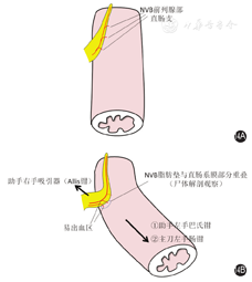 本研究通过尸体标本的横断面和活体解剖进行同步比对,有助于将NVB前列腺部脂肪垫当做一个整体进行观察。在前列腺底和前列腺中部水平,NVB前列腺部脂肪垫和直肠系膜关系最为密切,两者投影线存在较大重叠,其本质上是NVB发出的直肠支,该区域是术中NVB前列腺部微出血的高危区。从功能上说,Stelzner等[10]的解剖学研究发现,NVB发出的直肠支沿着肛提肌上缘,从直肠两侧前壁穿过直肠壁纵肌,移行为内括约肌神经,支配肛门内括约肌,该神经参与维持肛门功能。从头侧向尾侧观察,NVB前列腺部在不同水平均发出直肠支供应直肠,为TME前侧壁分离时的易出血区。见图14A。直肠前侧壁游离过程中,在主刀和助手的对抗牵引作用下,NVB的直肠支为张力最高的区域,容易直接拉断出血。此外,助手将NVB向前外侧推挡,亦使NVB更改原有形态,呈"S"型,容易误导切割方向而致出血。见图14B。对不同力学牵拉作用下的NVB前列腺部脂肪垫形态的充分理解,保持适当张力,并采用超声刀及时紧靠直肠固有筋膜凝结直肠支,有助于NVB前列腺部的保护。