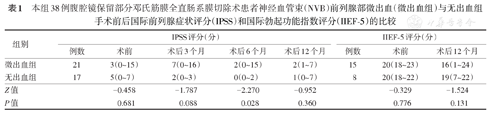 将研究者甲的观察结果与研究者乙的分析结果进行合并,分析比较全组38例患者NVB前列腺部微出血组与未出血组手术前后IPSS评分;纳入术前性活跃(定义为术前IIEF-5≥18分)的23例患者分析比较手术前后的IIEF-5评分,其中术后12个月性功能恢复至术前水平定义为术后12个月IIEF-5下降<3分、且患者主观性功能满意情况恢复至术前水平。
