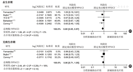 有5篇文献报道了OS[9,13,15,17,19];其异质性检验提示各研究间异质性较小(P=0.74,I2=0),因此采用固定效应模型进行分析,结果显示,TNT组较nCRT组的OS更高(HR=0.80,95%CI:0.65~0.97,P=0.03),见图2A。