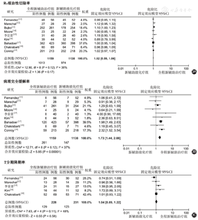 有5篇文献报道了T分期降期率[11,12,15,16,18];其异质性检验提示各研究间异质性较小(P=0.11,I2=48%),因此采用固定效应模型进行分析,结果显示,TNT组与nCRT组的T分期降期率相近(RR=1.04,95%CI:0.89~1.22,P=0.58),见图3C。