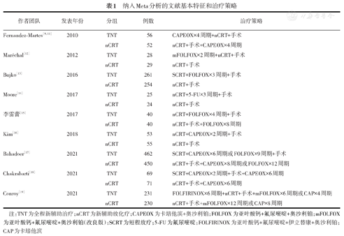 注:TNT为全程新辅助治疗;nCRT为新辅助放化疗;CAPEOX为卡培他滨+奥沙利铂;FOLFOX为亚叶酸钙+氟尿嘧啶+奥沙利铂;mFOLFOX为亚叶酸钙+氟尿嘧啶+奥沙利铂(改良版);SCRT为短程放疗;5-FU为氟尿嘧啶;FOLFIRINOX为亚叶酸钙+氟尿嘧啶+伊立替康+奥沙利铂;CAP为卡培他滨